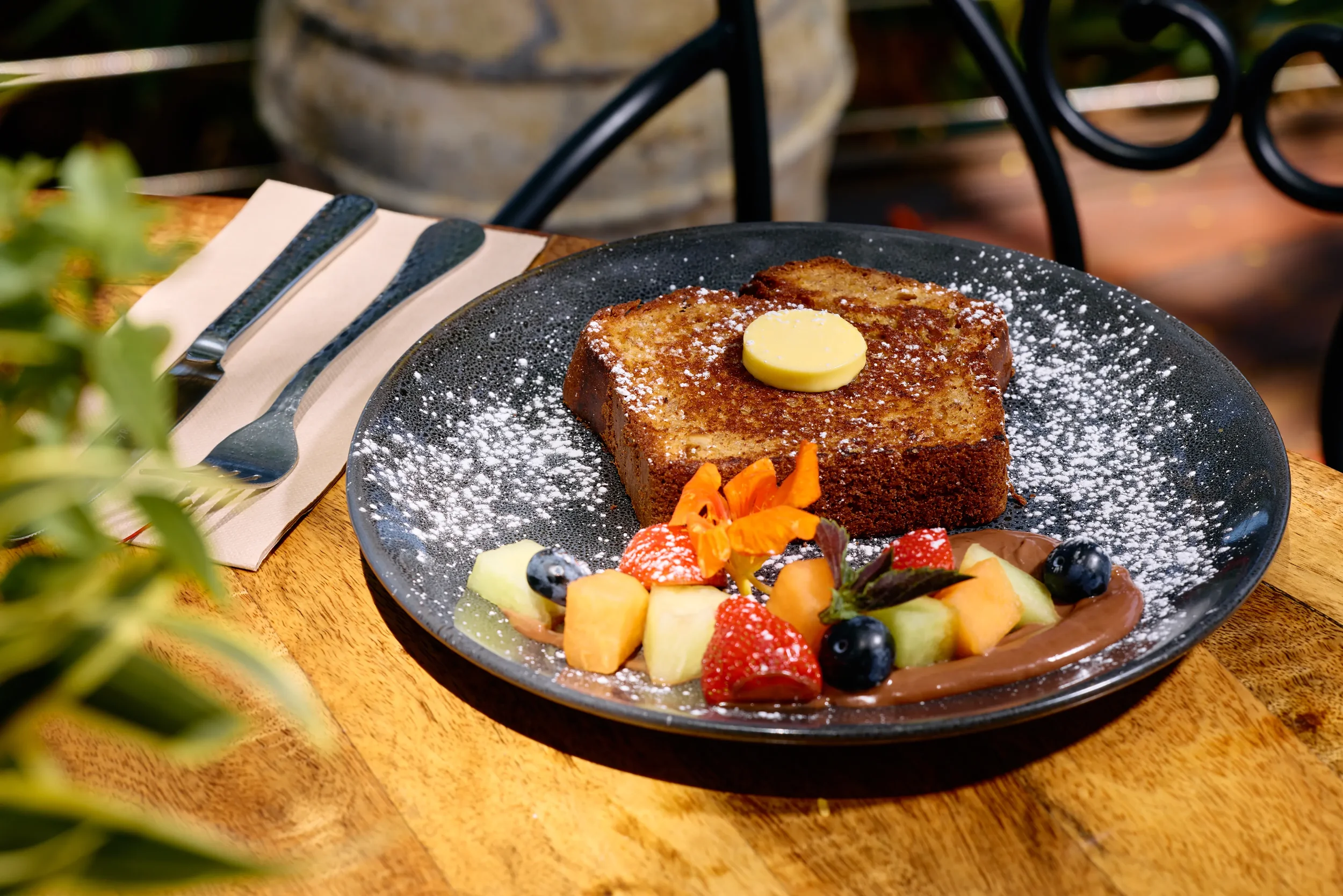 Light Ricotta And Matcha Batter, Lemon Myrtle Honey, Bacon, Seasonal Fruits, Vanilla Ice Cream, Toasted Macadamias