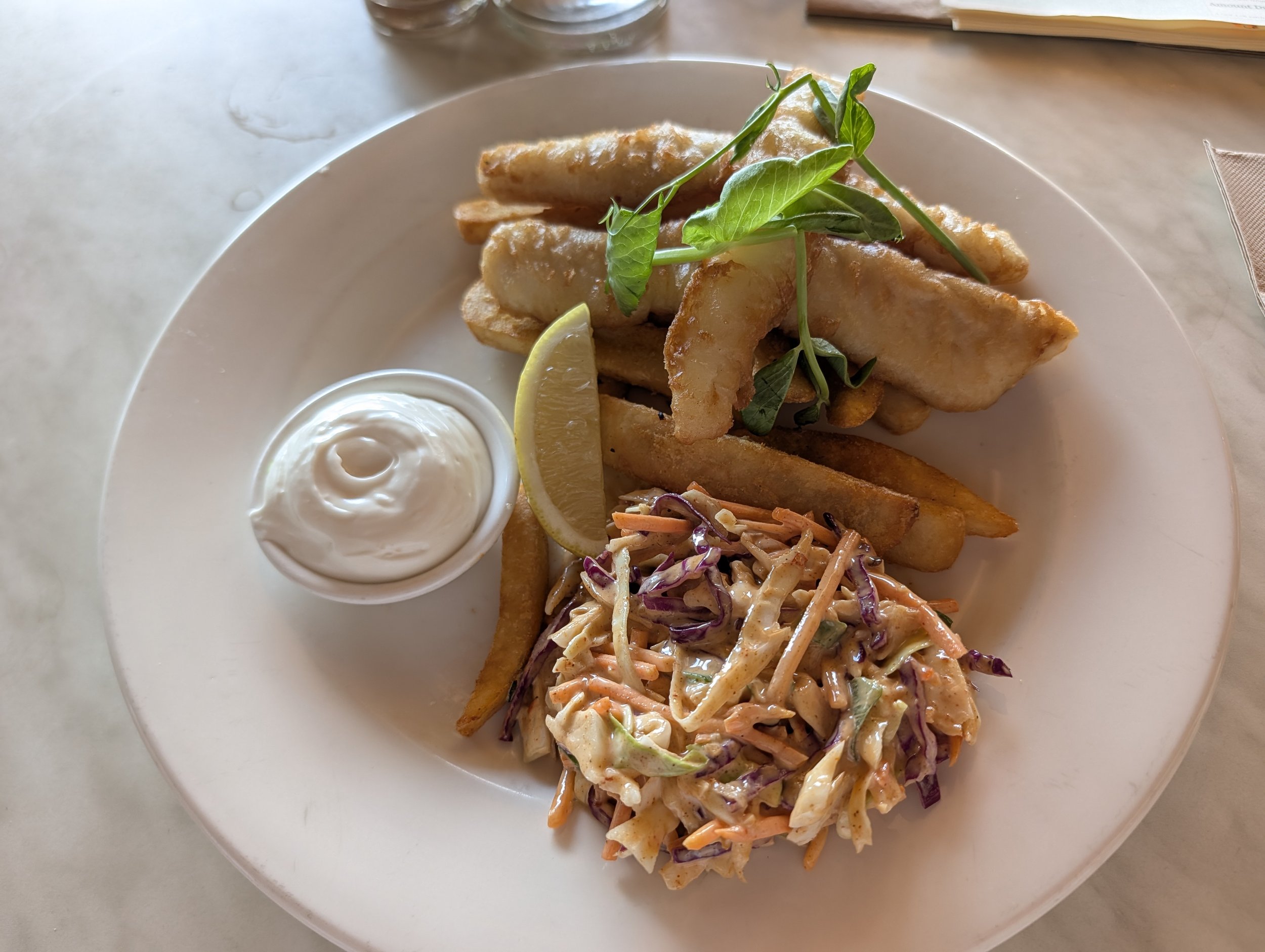 Crispy flathead fillets (3), served w/ creamy chipolte slaw, beer-battered chips and aioli